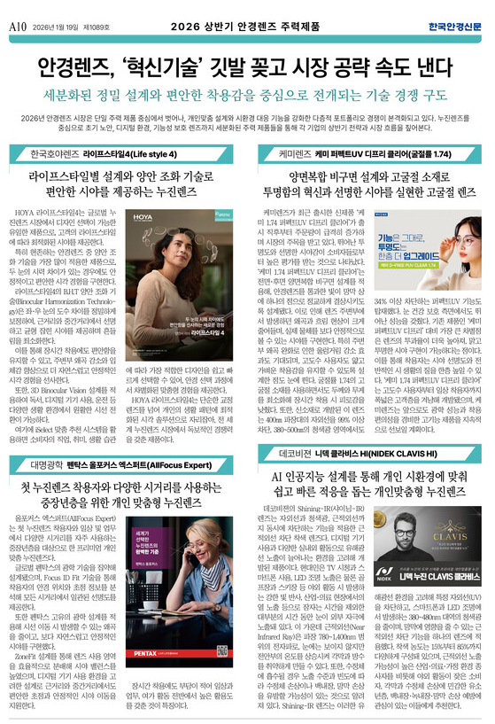 2026년 안경렌즈 시장은 단일 주력 제품 중심에서 벗어나, 개인맞춤 설계와 시환경 대응 기능을 강화한 다층적 포트폴리오 경쟁이 본격화되고 있다. 누진렌즈를 중심으로 초기 노안, 디지털 환경, 기능성 보호 렌즈까지 세분화된 주력 제품들을 통해 각 기업의 상반기 전략과 시장 흐름을 짚어본다.